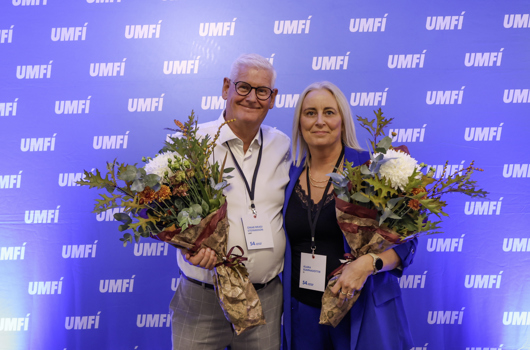 Þau Klara Bjarnadóttir, formaður Ungmennafélags Grindavíkur, og Ómar Bragi Stefánsson voru sæmd Gullmerki UMFÍ á Sambandsþingi UMFÍ í gær. Ómar Bragi hlýtur Gullmerkið fyrir sjálfboðaliðastarf sitt fyrir knattspyrnudeild Tindastóls á Sauðárkróki.