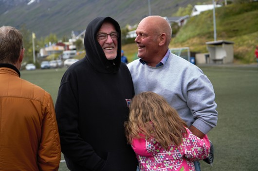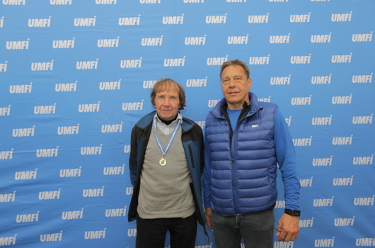 Haukur Valtýsson, formaður UMFÍ, afhenti í gær Markúsi Ívarssyni gullverðlaun fyrir fyrsta sætið í sínum flokki í hástökki á Landsmóti UMFÍ 50+. Verðlaunin átti að afhenda Markúsi síðdegis á föstudag. Hann hafði engan tíma til að taka við þeim þar sem lið hans í ringó var í þann mund að hefja leik.