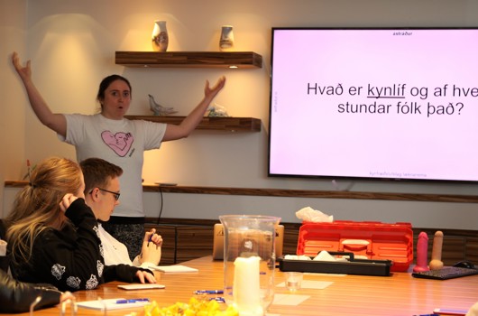 Sextán ungmenni hvaðanæva að frá landinu hittust í þjónustumiðstöð UMFÍ síðdegis í dag og hlustuðu á kynfræðslu á vegum Ástráðs, félags læknanema. Fræðslan er liður í skemmtisólarhring Ungmennaráðs UMFÍ fyrir ungt fólk á aldrinum 16 - 25 ára.