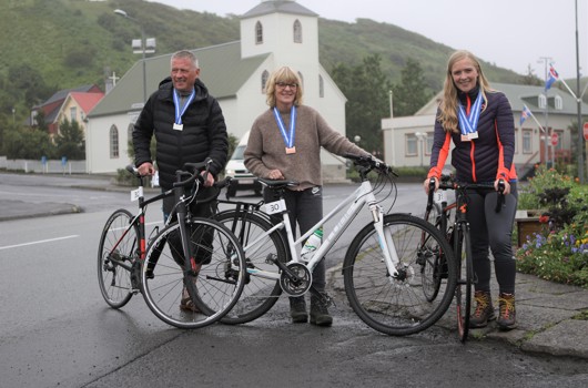 Eyjólfur og Ingibjörg og dóttir þeirra Ragnheiður skelltu sér saman í 65 kílómetra götuhjólreiðar á Landsmótinu á Sauðárkróki í dag. Þau hafa hjólað saman síðan síðastliðin tvö ár. Þeim finnst upplagt að blanda saman útilegu og íþróttum á Landsmótinu.