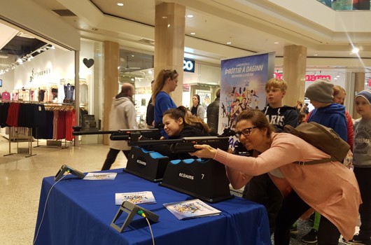Endalaus áhugi var á rafrifflum sem voru sýndir og fólki leyft að prófa á Sportdögum í Kringlunni í dag. Gestir á Sportdögum í Kringlunni fengu að prófa að skjóta í mark með rifflunum á sérmerktri skotbraut í göngugötu Kringlunnar þar sem UMFÍ kynnti Landsmótið sem verður á Sauðárkróki í sumar.