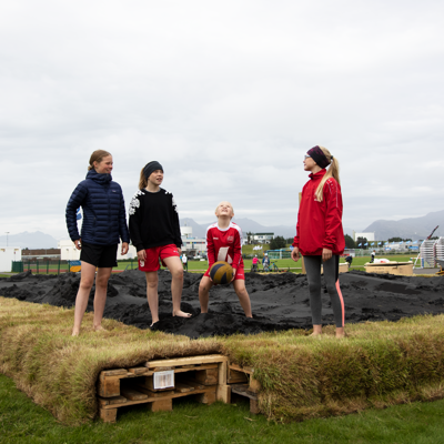 Þótt völlurinn sé ekki fullbúinn kom það ekki í veg fyrir að þær Karen Hulda, Birta Ósk, Arney og Elín Ósk gætu skemmt sér á fyrsta degi Unglingalandsmóts UMFÍ. Enda er blíðskaparveður, léttskýjað, stilla og 11 gráðu hiti.