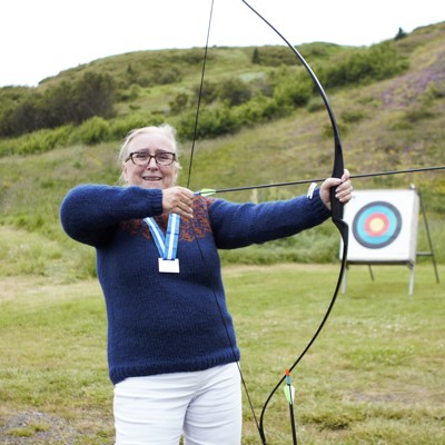 Ásthildur Einarsdóttir jurtalæknir tók sig vel út með bogann í keppni í bogfimi í gær. Þetta var í fyrsta sinn sem hún mundaði boga. Það skiptir öllu máli að vera með því hún lenti í 2. sæti í kvennaflokki.