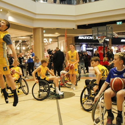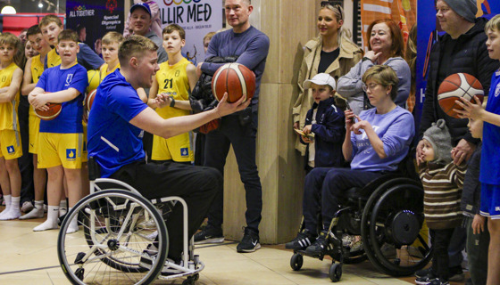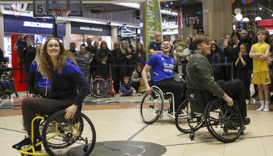 Landsliðsfólk í körfubolta keppti sín á milli í körfubolta í hjólastól en gestum og gangandi var líka boðið að taka þátt. Bræðurnir Matthías og Hálfdán í VÆB voru staddir í Kringlunni á sama tíma og skelltu sér í æsispennandi leik með nokkrum Kringlugestum.