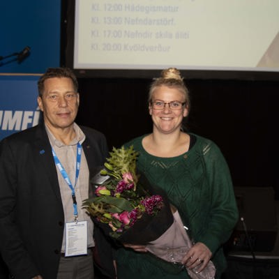 Haukur Valtýsson, formaður UMFÍ, afhenti þeim viðurkenninguna og bætti við Hrönn muni örugglega eitthvað láta til sín taka meðfram búskapnum á Suðurlandi.