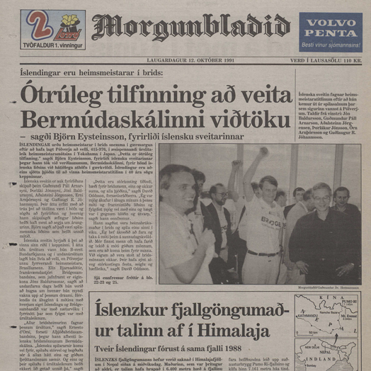 „Það kom okkur á óvart að vinna. Við vorum búnir að gera ýmislegt öðruvísi í undirbúningi okkar, við gengum á fjöll, hlupum saman og fórum í fótbolta og ýmislegt fleira en að spila. En það styrkti okkur var að gera eitthvað saman í stað þess að spila,“ segir Aðalstein Jörgensen, einn af fjórmenningunum sem lönduðu heimsmeistaratitli í bridds í Yokohama í Japan í október árið 1991.