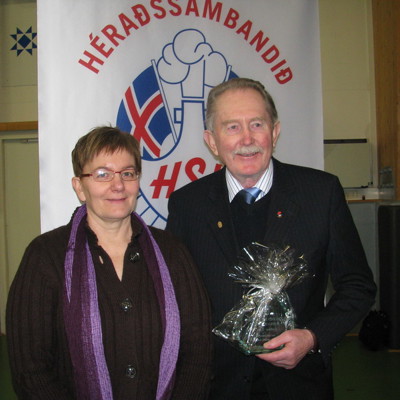 Á myndinni hér að ofan er Jóhannes með Guðríði Aadnegard, formanni HSK, þegar hann var sæmdur heiðursformaður.