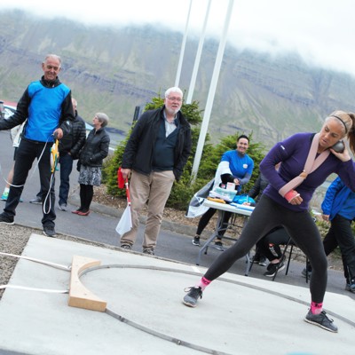 „Við erum miklar fjallageitur og vorum í tjaldvagni uppá Héraði þegar okkur datt í hug að prófa að æfa okkur fyrir mótið á Vilhjálmsvelli á Egilsstöðum. Við höfðum nefnilega skráð okkur í lóðkast, 800 metra hlaup, spjótkast og fleira. Ég var í skóm með lykkjureim sem losnaði þegar ég var hálfnuð í hlaupi. Hægri stóra táin fór inn í lykkjuna og ég flaug á hausinn. Næsta morgun fór ég til læknis og hann sá sprungu og brot á olnbogaliðnum. Ég var gifsuð frá öxl og niður að olnboga,“ segir Harpa en er fljót að bæta við að hún hafi ákveðið að koma til Neskaupstaðar þar sem maður hennar var í heilu lagi og ætlaði að keppa.