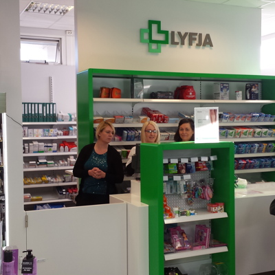 Lyfja á Höfn í Hornafirði er útibú Lyfju á Selfossi. Á sunnudag bætist í hópinn Vilborg, apótekari Lyfju á Selfossi sem verður með fjölskyldu sinni á mótinu.