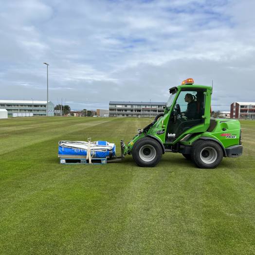 Tjöldin eru stór og þung og eru geymd í gámunum sem fluttir voru á mótasvæði Unglingalandsmótsins í gær. Lítinn lyftara þurfti til að flytja tjöldin úr gámnum og fjöldi fólks kom að því að reisa tjöldin og allar súlurnar sem halda þeim upp.