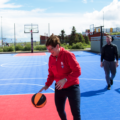 Sigríður brá á leik með þeim Ingibjörgu Klöru Helgadóttur, formanni Ungmennasambands Skagafjarðar (UMSS) og Þorvaldi Gröndal, frístundastjóra Skagafjarðar á körfuboltavellinum framan við Ársskóla á Sauðárkróki í dag.