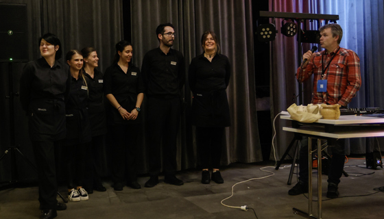 Sigurbjörn þakkaði fyrir útnefninguna en var síðan hvattur til að kalla fram kokka og matreiðslufólk hótelsins og biðjast afsökunar á framferði sínu, sem hann gerði.