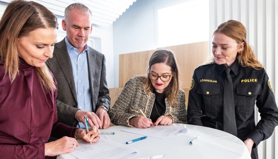 Ásdís Kristjánsdóttir, bæjarstjóri Kópavogs; Almar Guðmundsson, bæjarstjóri Garðabæjar; Helga Sigríður Þórsdóttir, rektor MS og fulltrúi framhaldsskólanna á höfuðborgarsvæðinu og María Káradóttir, staðgengill lögreglustjórans á höfuðborgarsvæðinu við undirritunina.