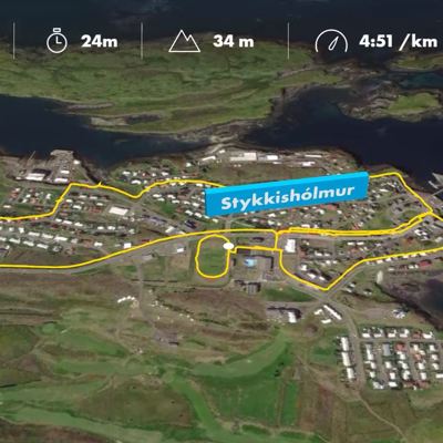 Keppt verður í götuhlaupi á Landsmóti UMFÍ 50+ í Stykkishólmi á milli klukkan 17:00 - 18:00 í dag. Þetta er fimm kílómetra hlaup sem hefst við íþróttahúsið og verður hlaupið eftir fallegri leið inni í bænum. Leiðina má sjá á myndinni hér að ofan.
