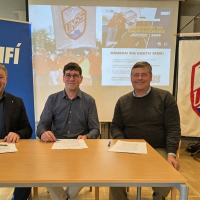 Á myndinni eru þeir Sigfús Ingi Sigfússon, sveitarstjóri sveitarfélagsins Skagafjarðar, Gunnar Þór Gestsson, formaður UMSS, og og Jóhann Steinar Ingimundarson, formaður UMFÍ, um það leyti þegar þeir undirrituðu samninginn í gær.
